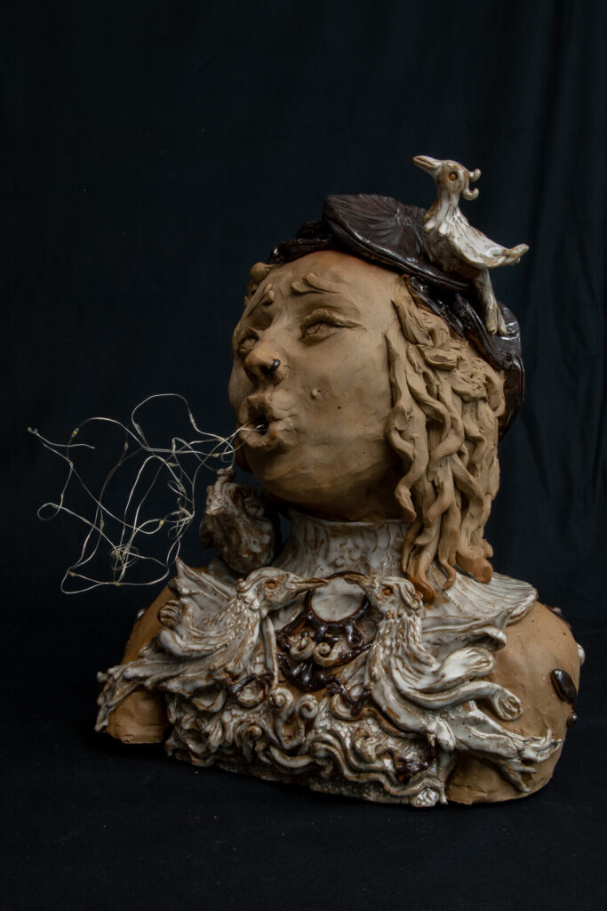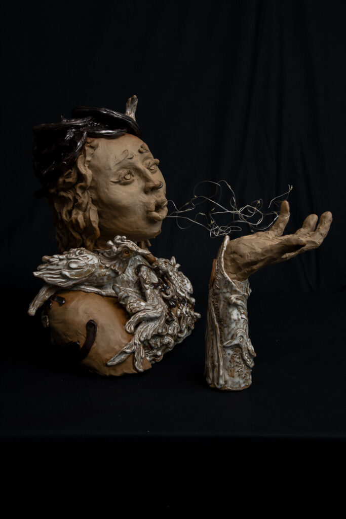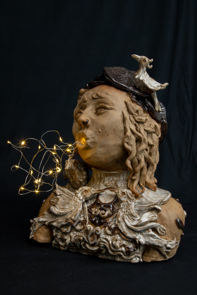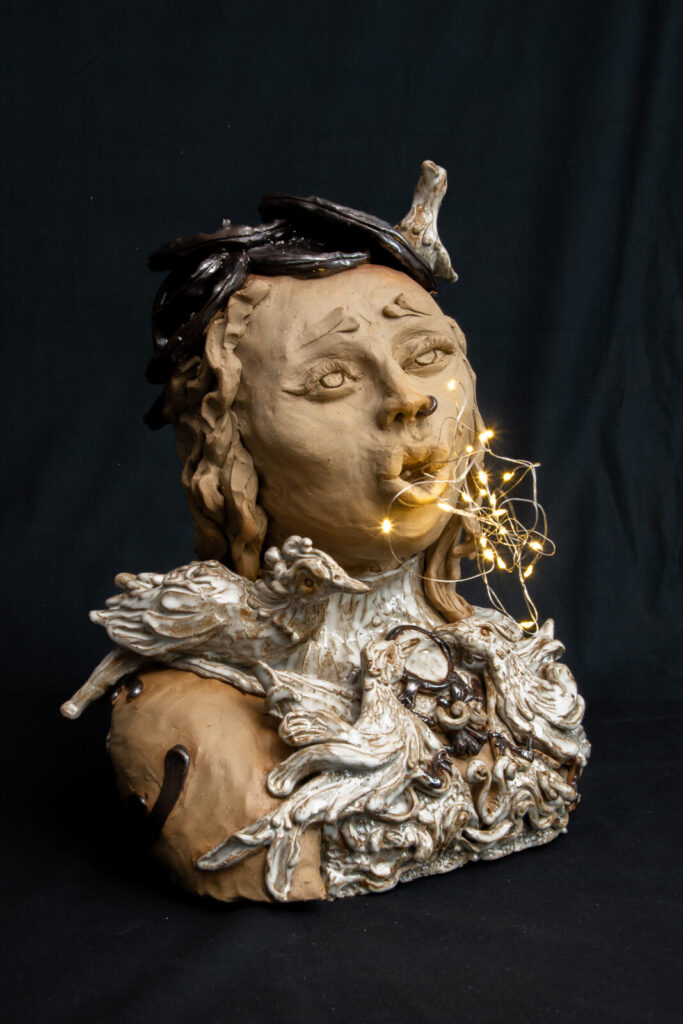 Zweiteilige Figur. Aus lederfarbenem Ton mit opalweißer und bronze-silbrig glänzender Glasur. in den Details Einarbeitung von vielen Vögeln. Über eine versteckte LED-Schnur kann über eine Zeitschaltuhr die Lichterkette kontrolliert werden.