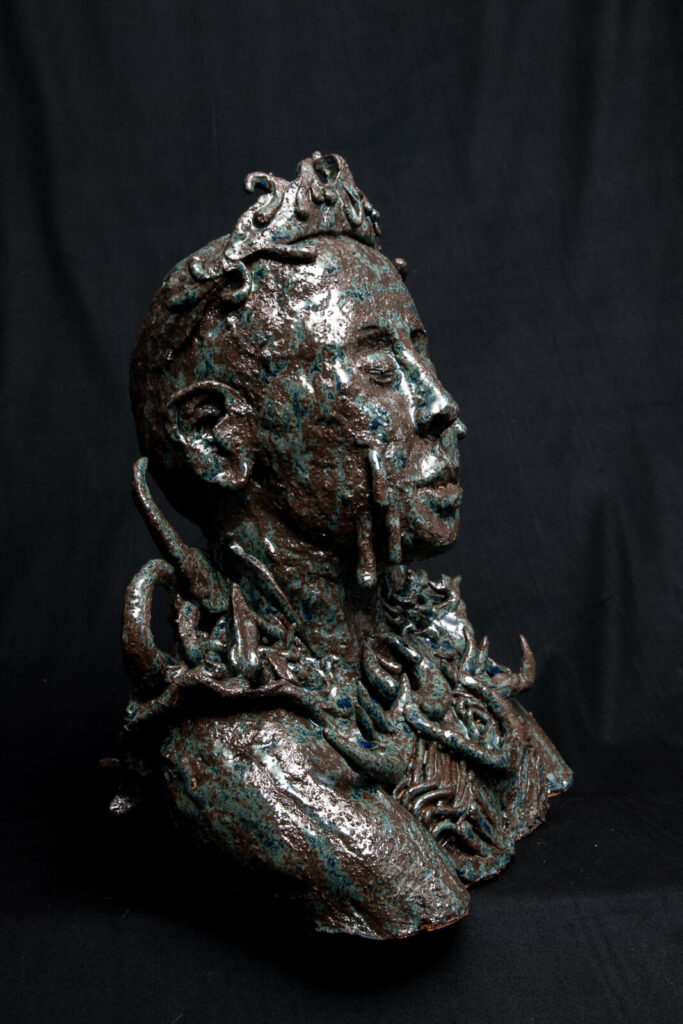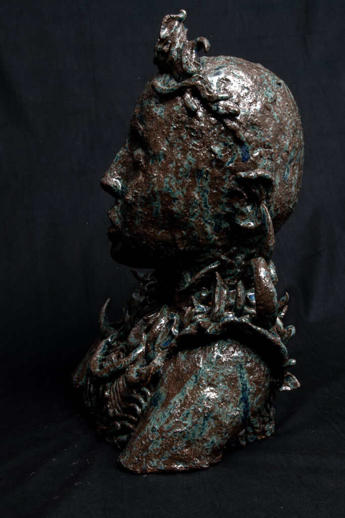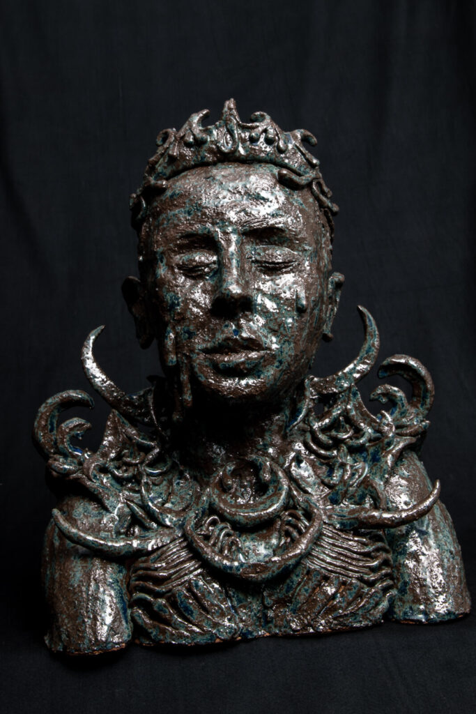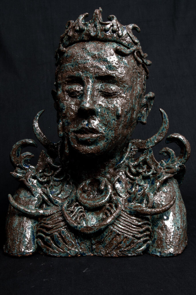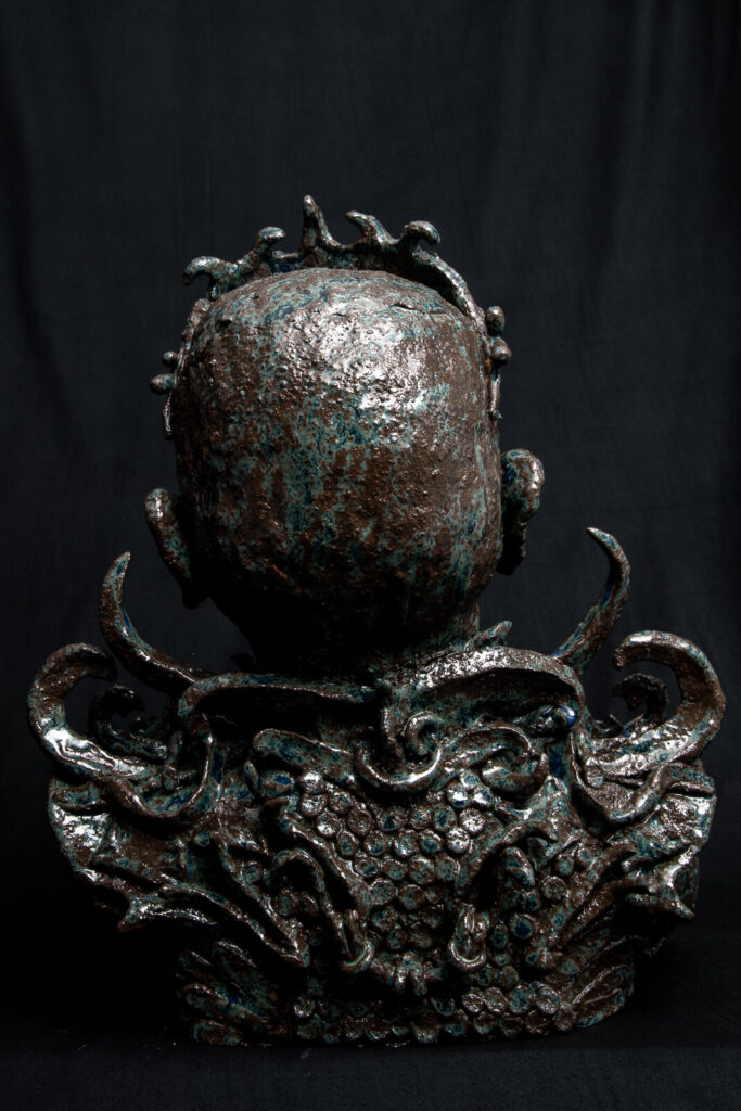 LatifahGemacht aus hoch schamottiertem Ton ist die Oberfläche körnig. Die Glasur sorgt für vielschichtige Farbakzente von dunklem Braun/Grau bis Tiefblau. Durch den stark glänzenden Schimmer und die Farben wirkt die Figur nass. H: 45 cmB: 33 cmT: 23 cm Geeignet für Platzierung im Freien.