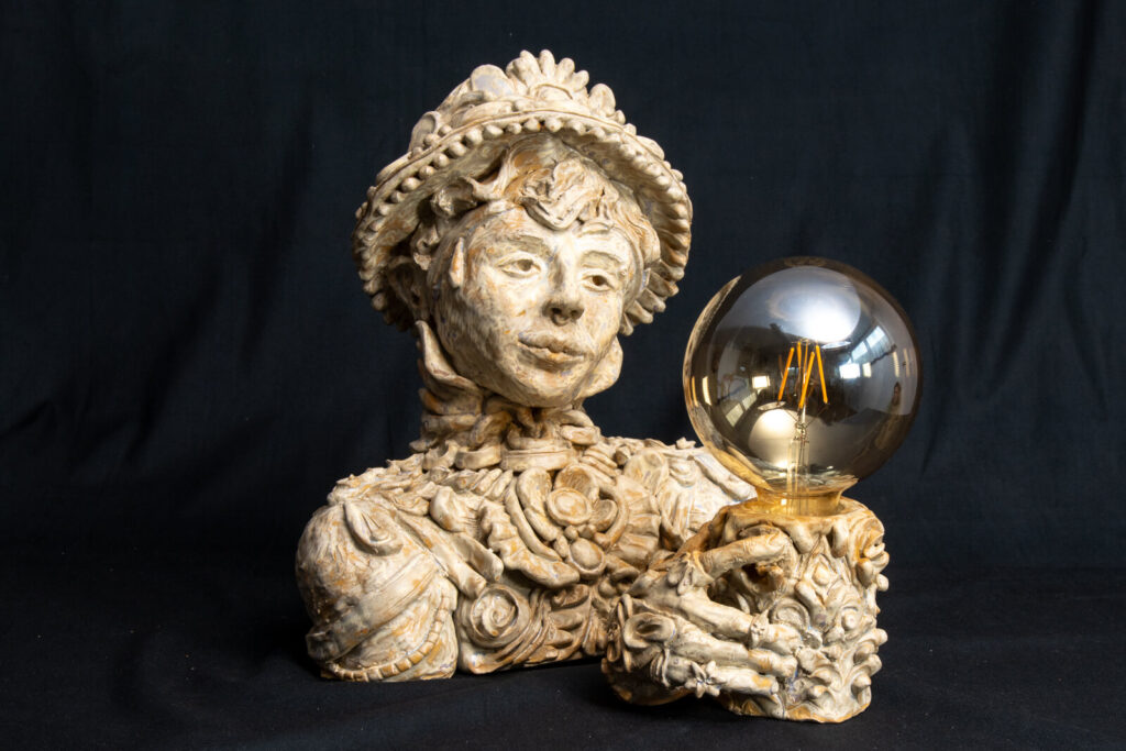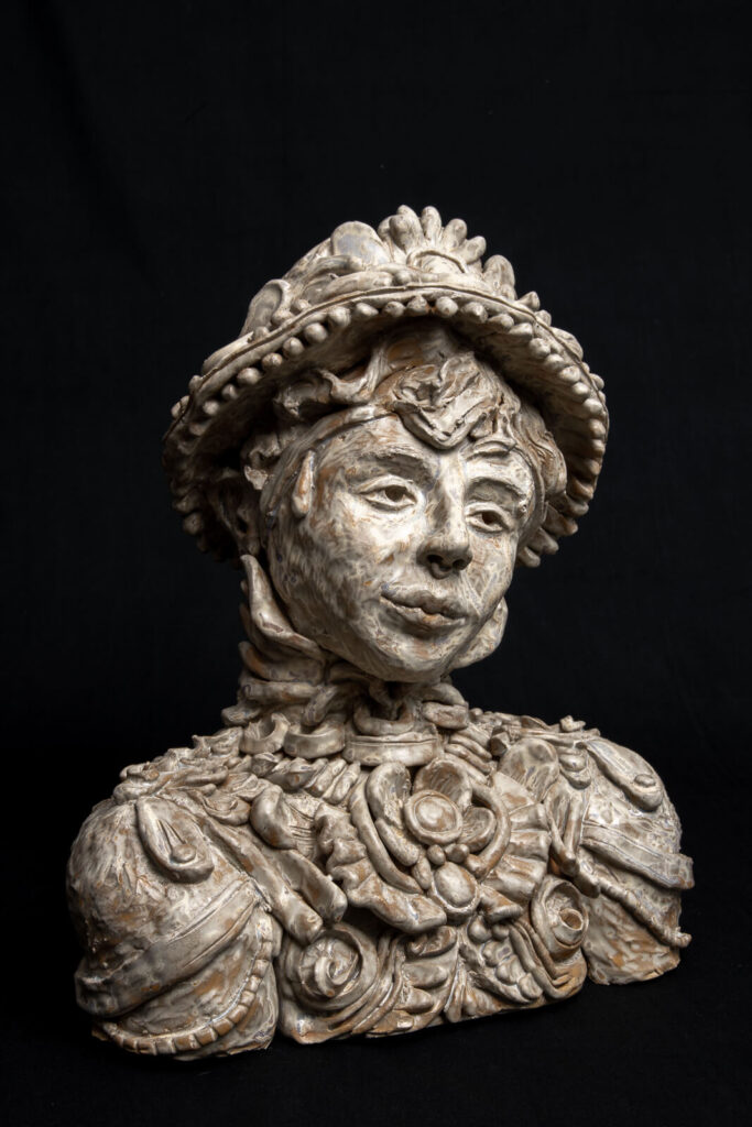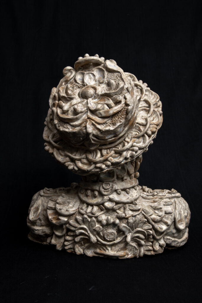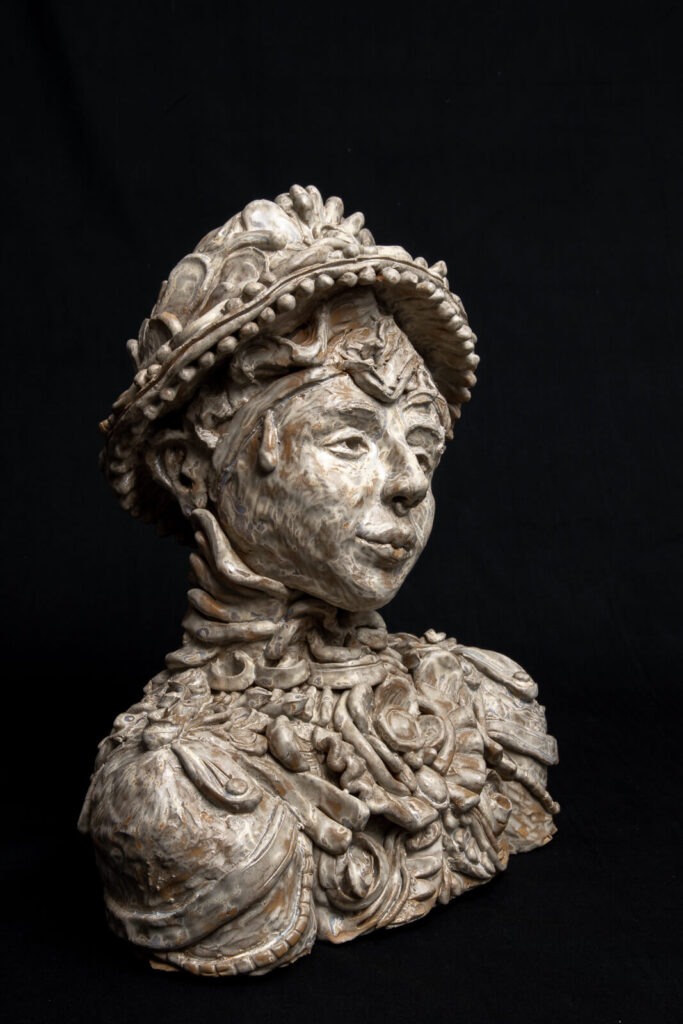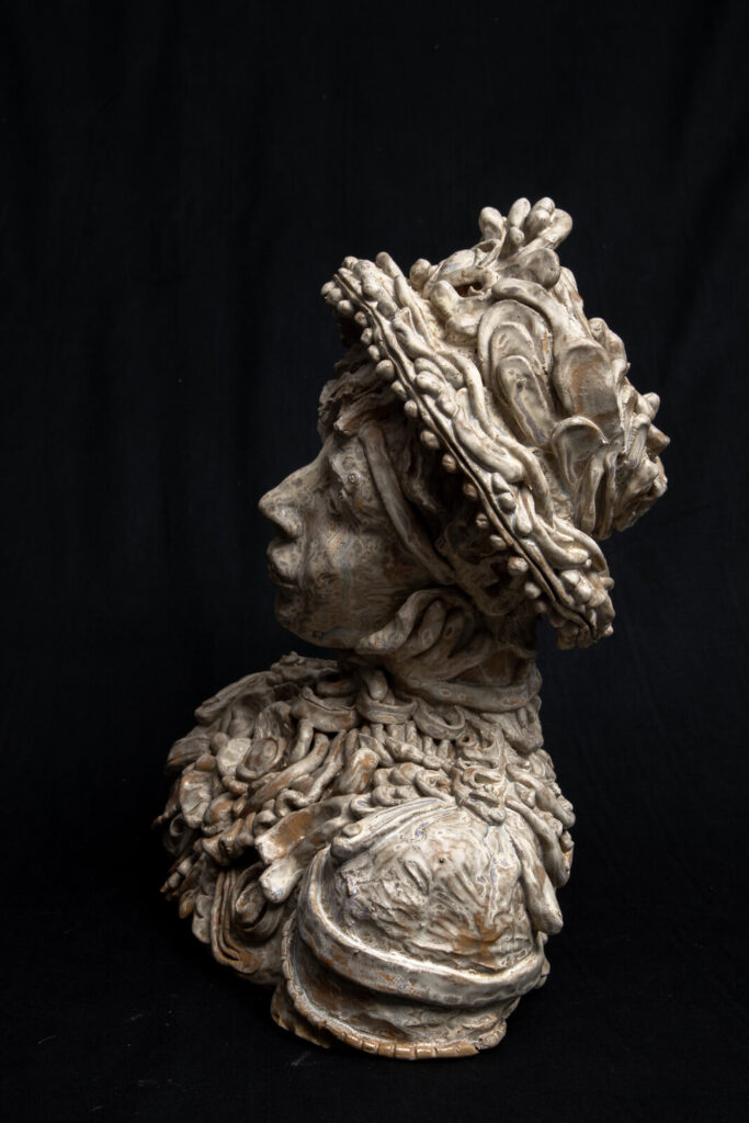 Zweiteilige Figur aus Hand und Körper. Aus hellem, schwach schamottiertem Ton. Die Glasurfarbe bewegt sich zwischen karamelligem Braun bis Graublau und Creme.
